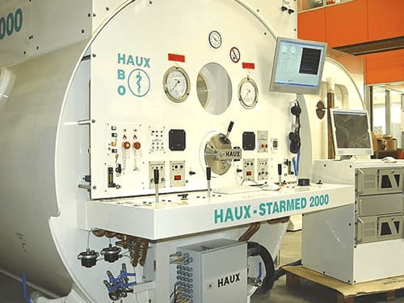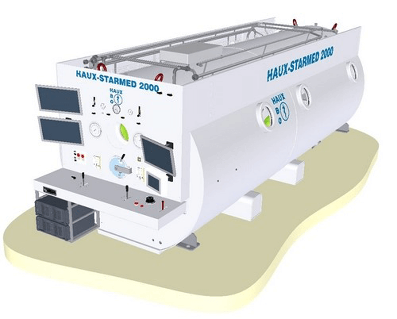 Cámara hiperbárica HAUX-STARMED fabricada en Alemania, disponible con antecámara y área principal o bien con dos espacios principales, en versiones de tres o cuatro áreas. Puede incluir diversos diseños de puertas (redonda, rectangular, otras) y en distintos tamaños. Permite un perfecto contacto visual mediante ventanas con ángulo de visión optimizado, disponibles en una variedad de diámetros. Incluye sistema de extinción de incendios, sistemas de control computarizados de fácil operación y el nuevo sistema de oxígeno con baja resistencia a la respiración Haux-Oxymaster.