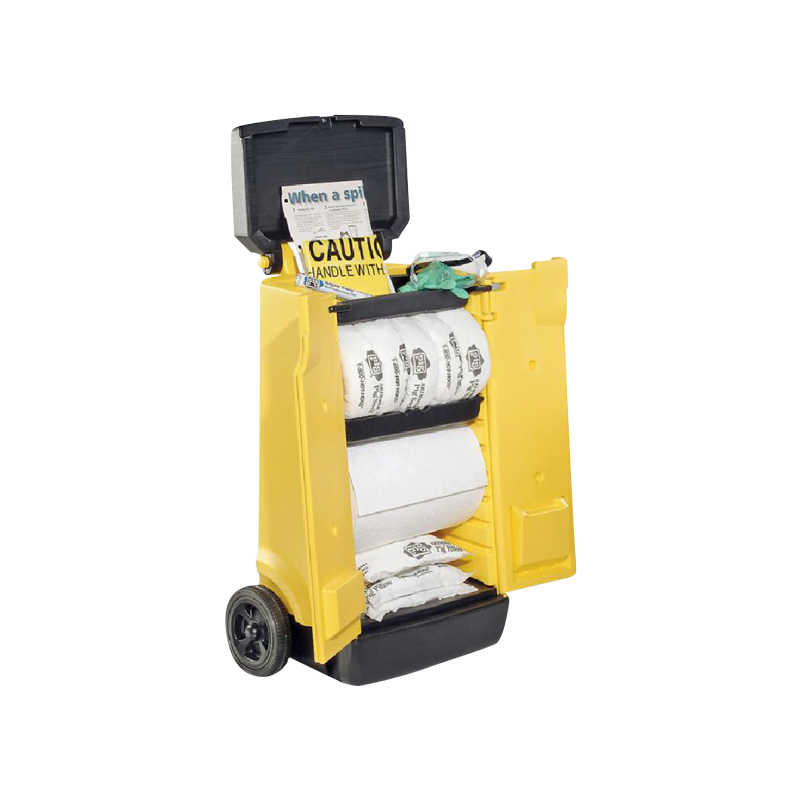 Carro de polietileno para control de derrames de aceite modelo 444; incluye diversos absorbentes y elementos para desechos.